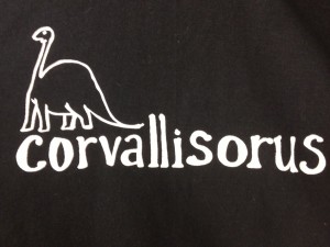 While the beaver may be our town’s totem animal, the mailing system identifies us as belonging to the age of the dinosaur. Glance at a piece of mail—like a bank statement, which is what Joshua Martin did—and you’ll notice you reside in the great CorvallisORUS. Martin, who has an ear for wordplay, was so tickled that he handcrafted some stickers to pass out to friends. When Bill McCanless of Interzone got a sticker, he encouraged Martin to put the idea on T-shirts. Which he did.