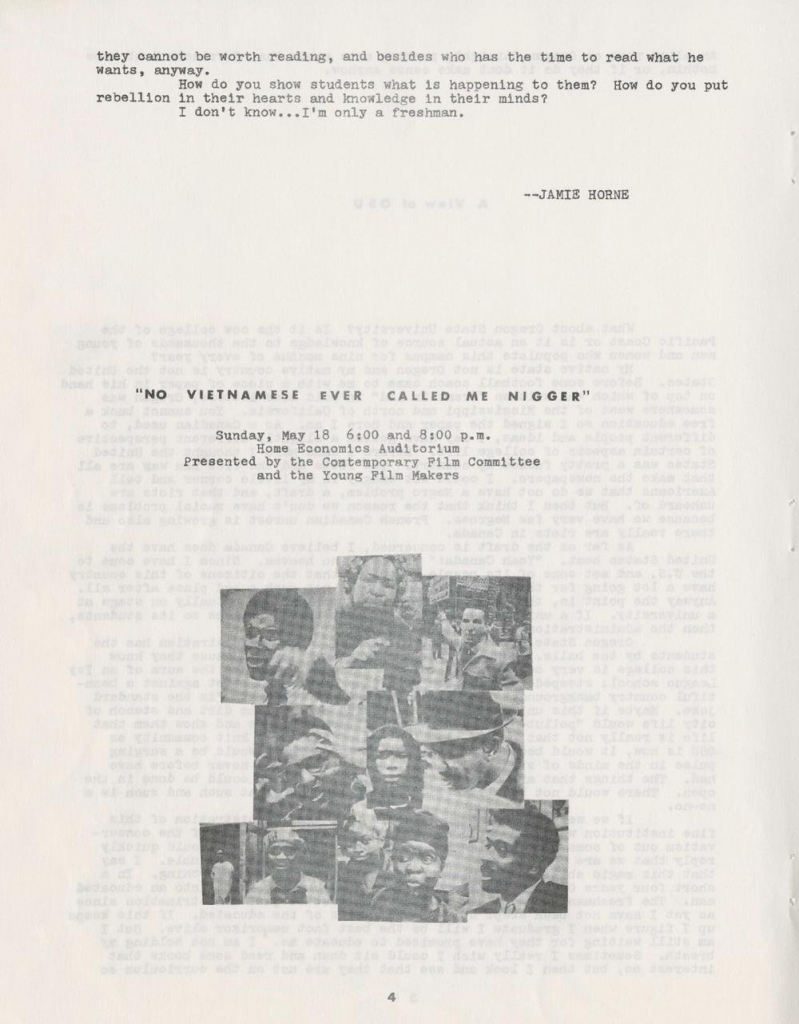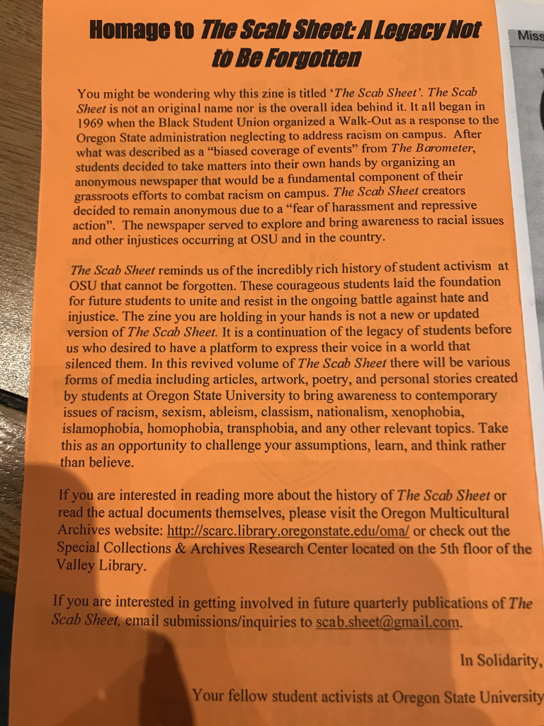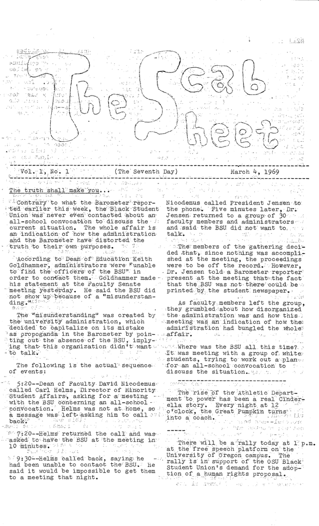 Of these, the Scab Sheet is especially well-remembered at OSU, as can be seen by its frequent revivals by students of later generations. The Scab Sheet’s prominence in the collective memory of the campus community is the result of its original incarnation centering on controversies in the Beavers football program, as the legendary Head coach Dee Andros came into conflict with African American players. A perceived lack of respect by Andros toward his players was symbolized by the Coach’s demand that player Fred Milton shave his beard. This battle of wills led to a broader controversy which reached its peak when almost the entire black student body withdrew from the University in protest.