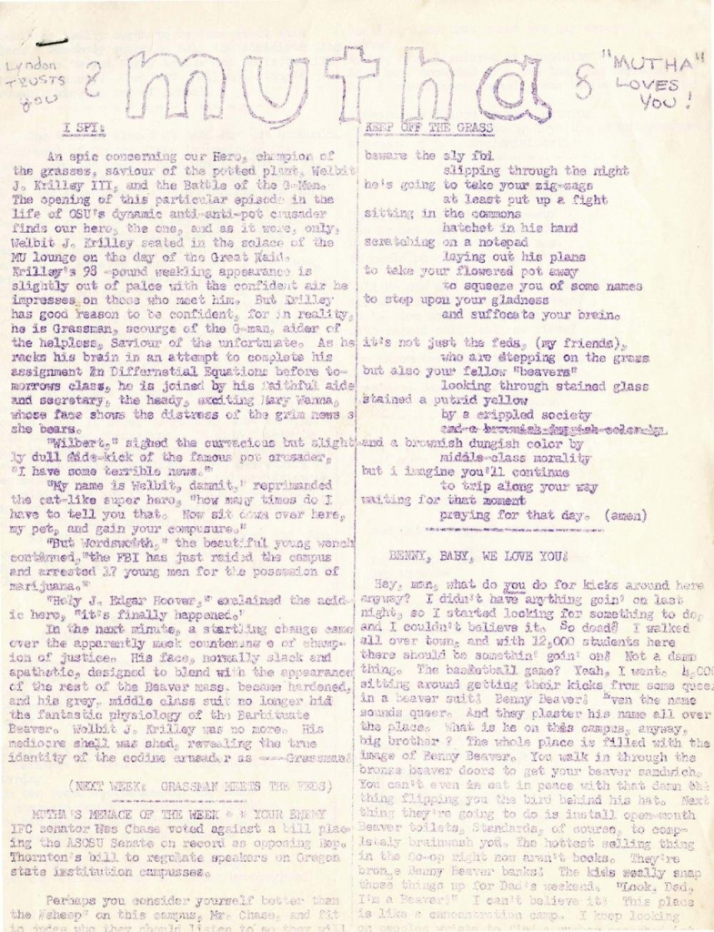 Strictly speaking, all student publications used to be “underground,” since there was originally no such thing as an “official” student publication, with its expenses paid out of the University budget. Even the Daily Barometer began as the College Barometer, a monthly publication a few students knocked off in their spare time – in fact, Oregon State University still does not have a School of Journalism, so the awards the Baro regularly receives are all the more impressive.