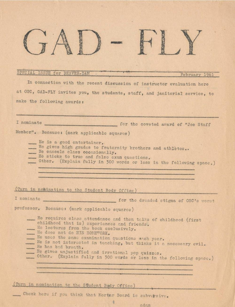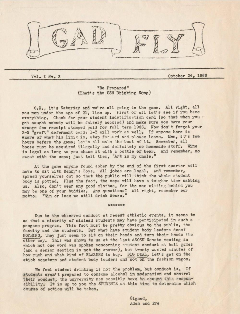 The real hot times for unofficial student publications, though, were the 1960s. That was when OSU hosted the Gad-Fly, the Oracle, the Mutha, Poor Jensen’s Almanac, the Tin Can, the Spark, and the Scab Sheet were produced by students and distributed all over campus.