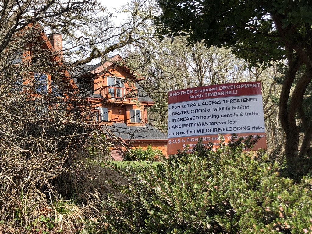 The S.O.S. GoFundMe, run by Timberhill neighbor Barbara Naimark, who lives very near the property in question, says, “The developer’s proposal limits the current dirt paths used by many area hikers, walkers, and cyclists to access the Forest.”