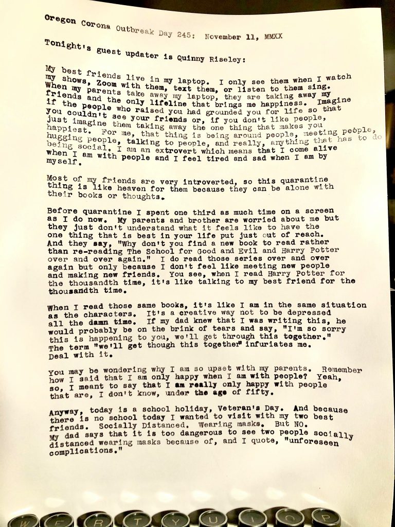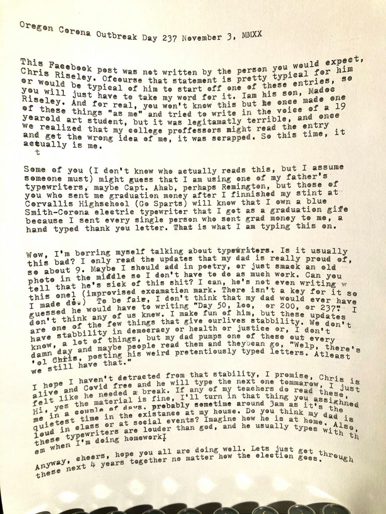 While living through a pandemic, months of protest and civil unrest, and another tumultuous presidential election, many of us may catch ourselves wondering how the history textbooks, documentaries, and museums will capture such events. Local Corvallisite Chris Riseley has been taking this job into his own hands – documenting the seemingly endless days of social isolation on his typewriter.