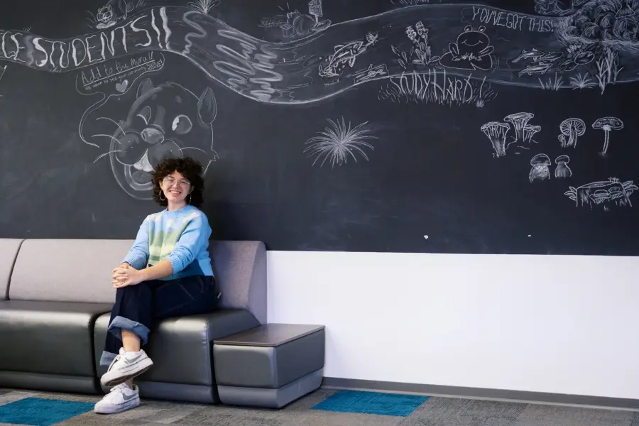 The idea for the mural came from discussions between Honors College Engagement and Recruitment Coordinator Taylor Maki and Communications Coordinator Kallie Hagel after the chalkboard in the SLUG was erased and cleaned over the summer. “Inviting Esme to tackle this project was a natural choice,” says Kallie.