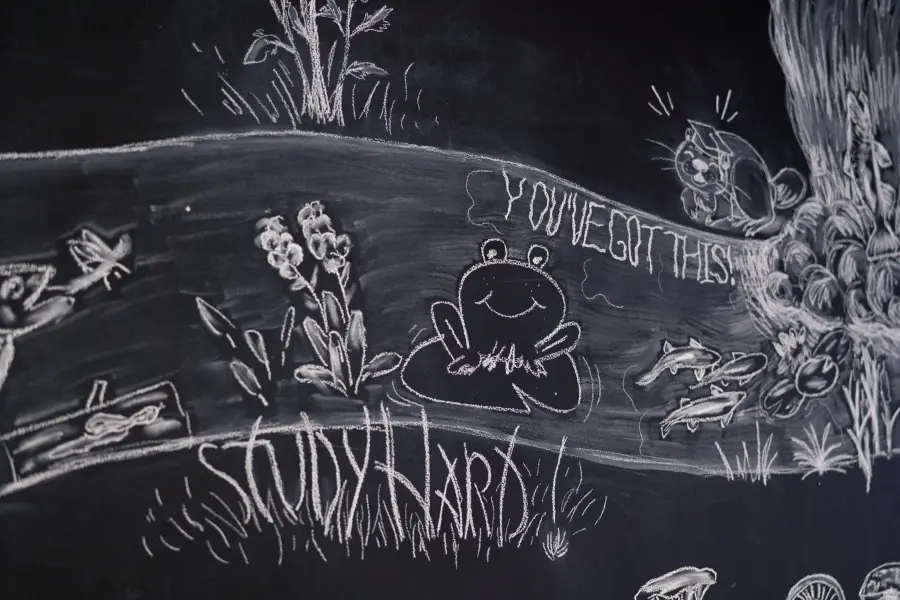 Esme began the project by sketching rough designs over the summer and ideating with Kallie. With the start of the academic year, Esme began her work on the chalkboard, hosting office hours three days a week and inviting help from fellow HC students.