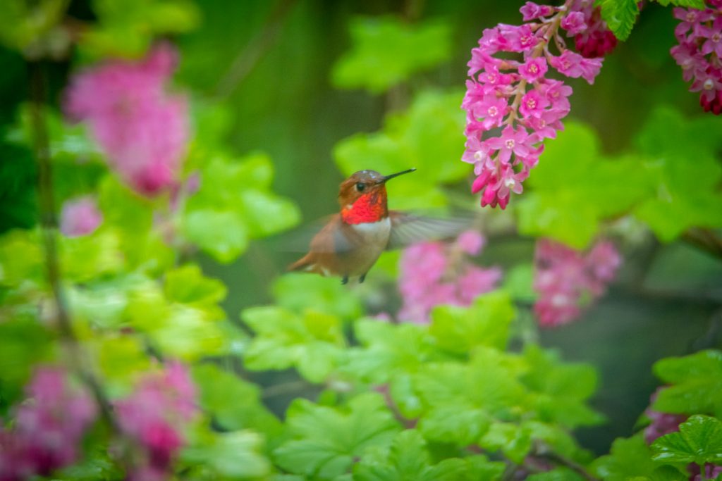 Using their distinctive beaks, Rufous hummingbirds use nectar as a food source, as well as insects. I’ve had the pleasure of witnessing their feeding on early-blooming native plants such as red-flowering currants, as well as on rosemary bushes and the later blooming ornamental fuchsias popular in hanging baskets. Debatably more entertaining is the brazen interactions a Rufous will initiate with any critter they deem in their way, whether it be another backyard bird or even a chipmunk. It is better than whatever show you are currently binging, or at least a healthy break from it.