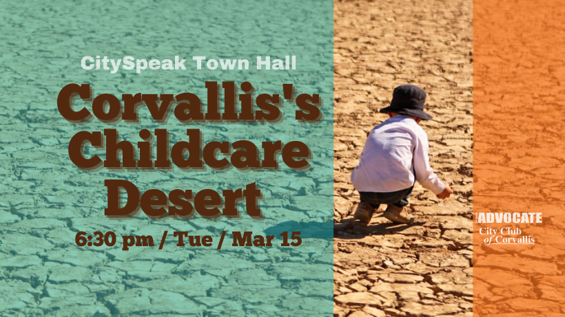 CitySpeak forums are free to the public, and are co-presented by City Club of Corvallis and The Corvallis Advocate. Sponsors include Peak Sports and First Alternative Natural Foods Co-op.