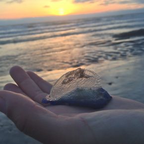 When not yet sand bound, one can spot velellas in the ocean’s shallows in their more preferred position – upright on the surface of the water. Underneath their sail, their oval-shaped body contains short tentacles that help them sting and catch small prey like plankton (but fortunately are not known to harm wading hominids).