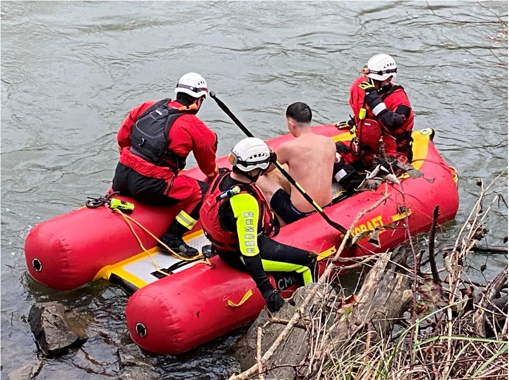 CFD personnel deployed their portable raft and three rescue swimmers, who then traveled upstream to retrieve one victim and one dog from the river. A second victim with a second dog along the riverbank was reached by ground crews who cut a path through heavy brush and helped the victim walk out on foot.