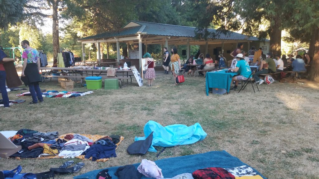 Future Possibilities in Ancient Care Practices: Saturday’s benefit show for the Corvallis Really Really Free Market’s (RRFM) free store, hosted at the Thompson Shelter at Avery Park, saw a communal sharing of artistic, material, and emotional support. Free resources – clothing, food, hygiene products, zines, etc. – live punk and experimental music performances, and tabling by local queer and trans artists aligned well with the show’s theme, “Capitalist Hell,” allowing folks in the community to express their experiences of impoverishment, exploitation, and unmet needs, as well as find more ways to cultivate spaces and relations of care outside of them.