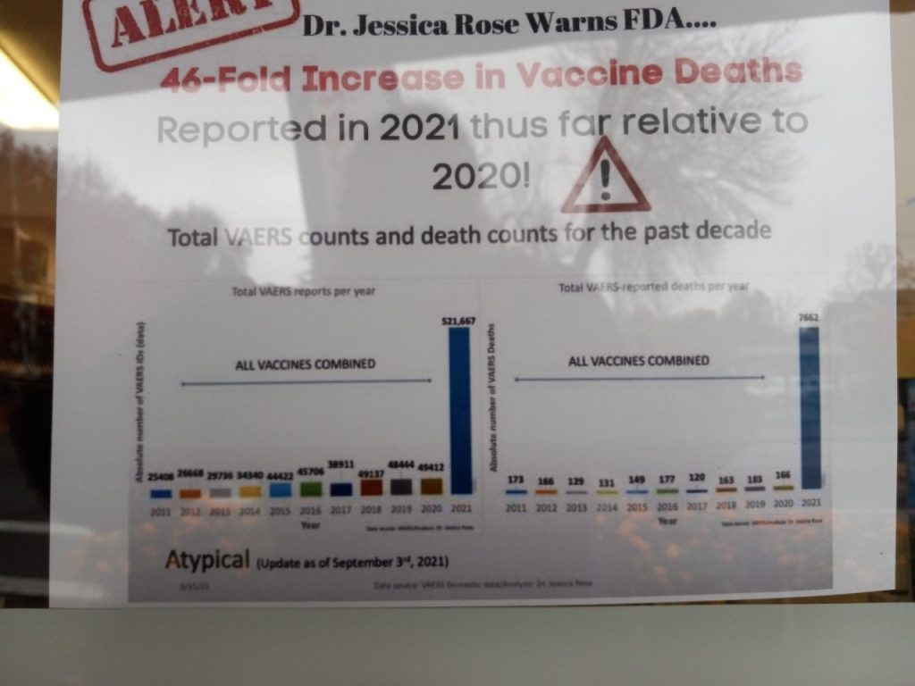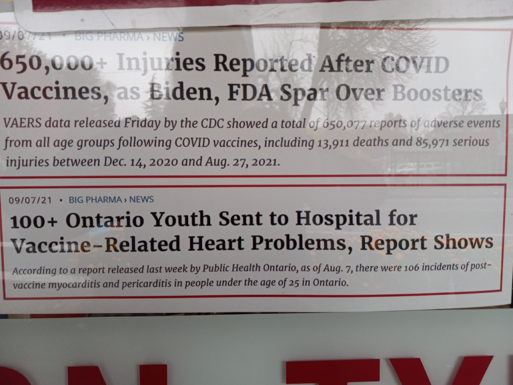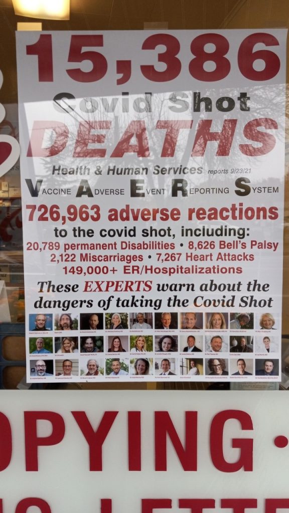 For several days now, people walking past the ProPrint copy shop at 6th and Monroe, across the street from the Corvallis-Benton County Public Library, have been seeing posters in the front window which warn of alleged harm resulting from the vaccines used against COVID-19.