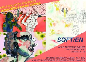 The exhibition will hang in CEI Artworks for a month. CEI is open Monday through Friday from 9 a.m. to 5 p.m. Soft/en will have an opening reception on Thursday August 17 from 4 p.m. to 8 p.m. This just so happens to be the same day as the Corvallis Arts Walk, so since you will already be in the area, drop on by and say hi.