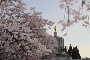 Homepage feature photo: The Oregon state Capitol through cherry blossoms. (Julia Shumway/Oregon Capital Chronicle)