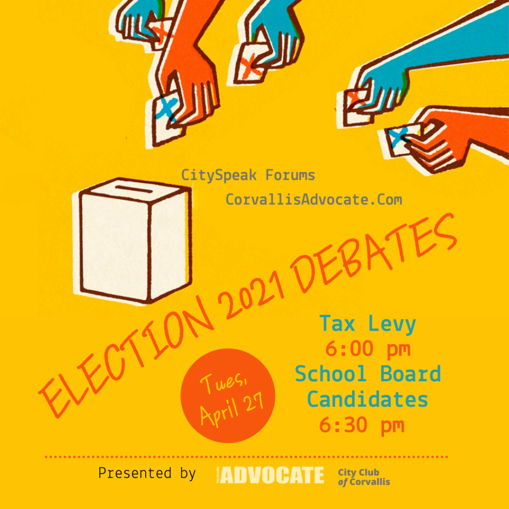 Bonus issue for Voters who really care, show up 30 minutes early on April 27 – at 6:00 p.m. – and you can learn all about the Local Option Tax Levy that will be on the ballot alongside the school board races. Panelists include Benton County Commissioner Xan Augerot and Benton County Sheriff Jefri Van Arsdall.