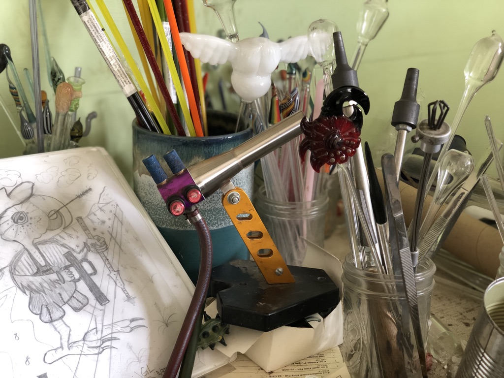 Jordan Lucas started his artistic career at age 19 as part of a cutting edge group in Corvallis bringing a specialized glass blowing technique called lampworking – or American Contemporary Flamework – to the next level. Over the years he’s had his successes, his highs and lows, and the desire for evolving into whatever creative inspiration draws him toward.