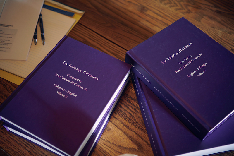 Each four-volume set contains more than 3,000 pages and weighs 20 pounds, with two books of English-Kalapuya translations and two of Kalapuya-English translations. McCartney, who passed away last year at 81, wasn’t a trained linguist but loved language and thought Kalapuya was “beautiful,” according to Aiyanna Brown, a Kalapuyan descendent.