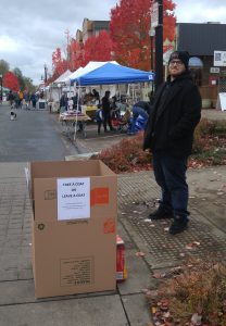 If you went to the Corvallis farmer’s market on Veteran’s Day weekend and walked down to the very end, you may have seen a man in a black sweatshirt sitting next to a large cardboard box that said, “Take a Coat or Leave a Coat.”