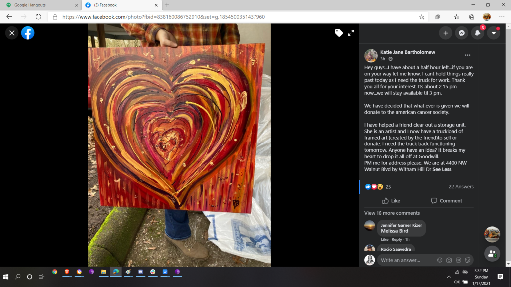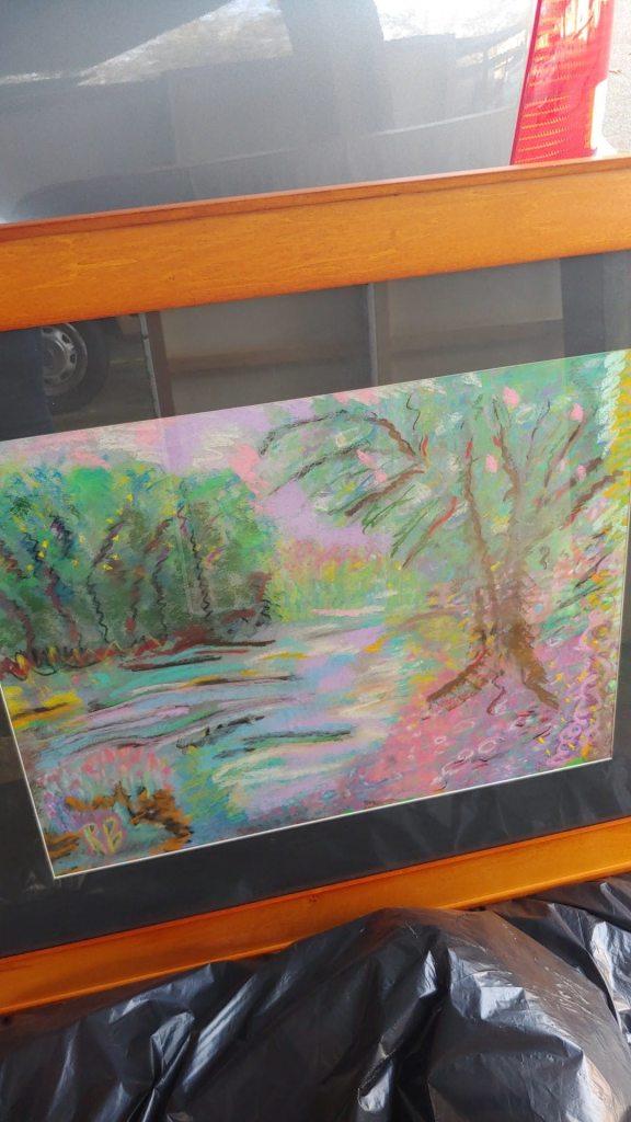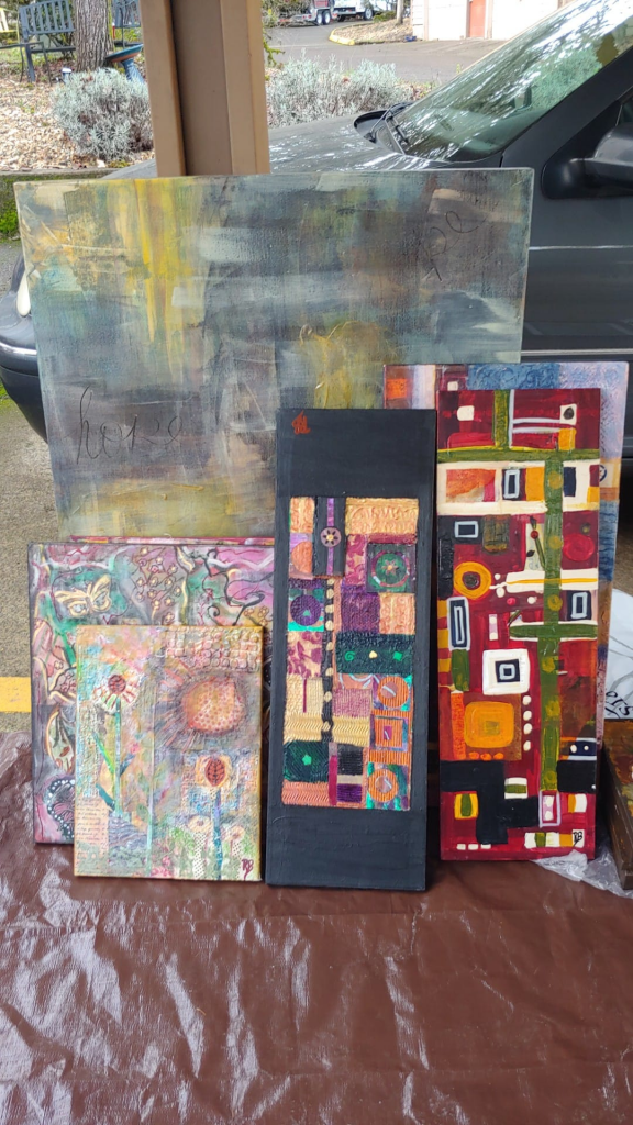 She sold as many of the paintings from the parking lot of the apartment complex as possible, and took the rest to Queen B Organizing, who will be arranging a sale in the next few weeks, with proceeds going to the American Cancer Society.