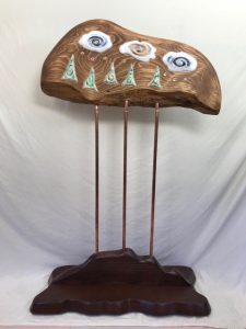 His featured artwork, “She Rose From the Sea,” was created by Donovan as part of a fundraiser for the Marys Peak Alliance. It incorporates cedar wood from Oregon, arrowheads created by a partnering artist of Kalapuyan descent, ceramic tiles by Donovan, and copper pipes that represent the geologic formation of the highest point in the Coast Range.
