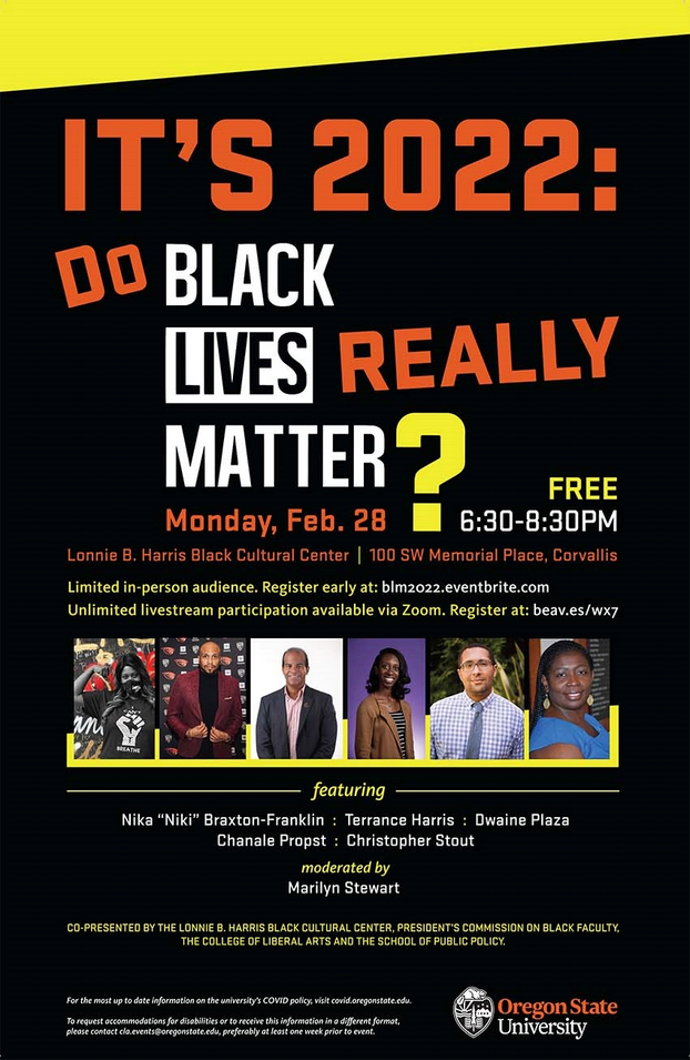 The event comes from the following units on campus: the Lonnie B. Harris Black Cultural Center, the President’s Commission on the Status of Black Faculty and Staff Affairs, the College of Liberal Arts, and the School of Public Policy. The event itself will be held and livestreamed from the Lonnie B. Harris Black Cultural Center at 100 SW Memorial Place in Corvallis.