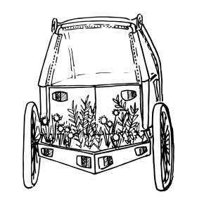 The trailer itself is sturdy and black with drainage holes drilled through the bottom and back wall. A small space on the back receives runoff and will house a separate grouping of moisture-tolerant plants. In the center will be interchangeable planting troughs packed with different vegetative and mineral groupings. Lightweight aluminum rods support a removable greenhouse tarp, and simply fold down to allow full access within.