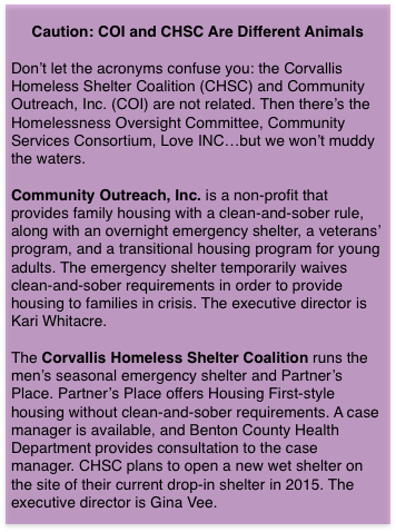 There is no assessment concerning the viability of Corvallis’ Community Outreach program, which may be better for clean and sober homeless, in an environment where two organizations of similar missions must coexist and seek funds.