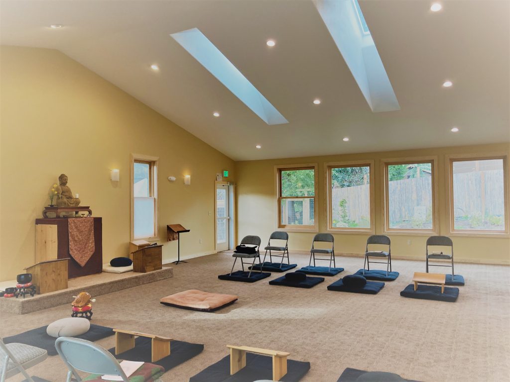 “This was the two-car garage,” said Temple Manager Pam Muir as we walked into the new meditation space. Muir explained that the whole SJZC community was involved in the demolition and renovation of what had been a standard 1970’s ranch-style home and is now the Zen Center. “The whole Sangha deconstructed the garage completely – people were up on the rafters taking the roof apart. It was amazing to see,” Muir recalled, using the Buddhist term “sangha” for community.