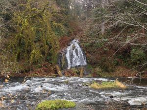 Well, to be fair, I head east, then I head south, and then more east on Blaine Road, where a brown road sign for the Upper Nestucca River Recreation Area beckons me on my ‘Ne-’ quest. Nestucca is another word I’ve come up short on in terms of meaning. But as the road I travel curves alongside it ever upwards, I soon forget that there is any other meaning but this movement I am so engulfed by. A little over an hour later, I reach my destination at a point where what I believe to be Nenamusa Falls is visible. Though this name is another mystery, I feel again at ease in the unknowing as gravity pulls the creek down a sheer cliff in front of me, directly into the droning Nestucca.