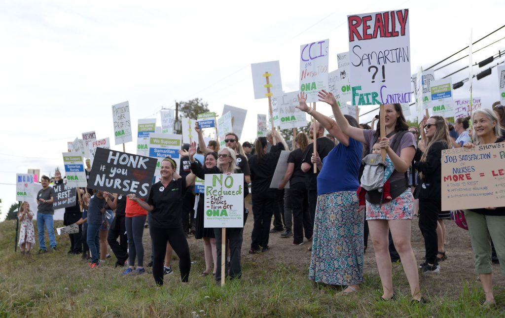 Nurses at Good Samaritan Regional Medical Center have been working without a contract since June 30. Throughout negotiations, Samaritan Health Services has refused to respond to basic information requests from nurses, cancelled negotiation meetings with little notice, and failed to respond to nurses’ proposals to improve staffing and patient safety and keep health care affordable.