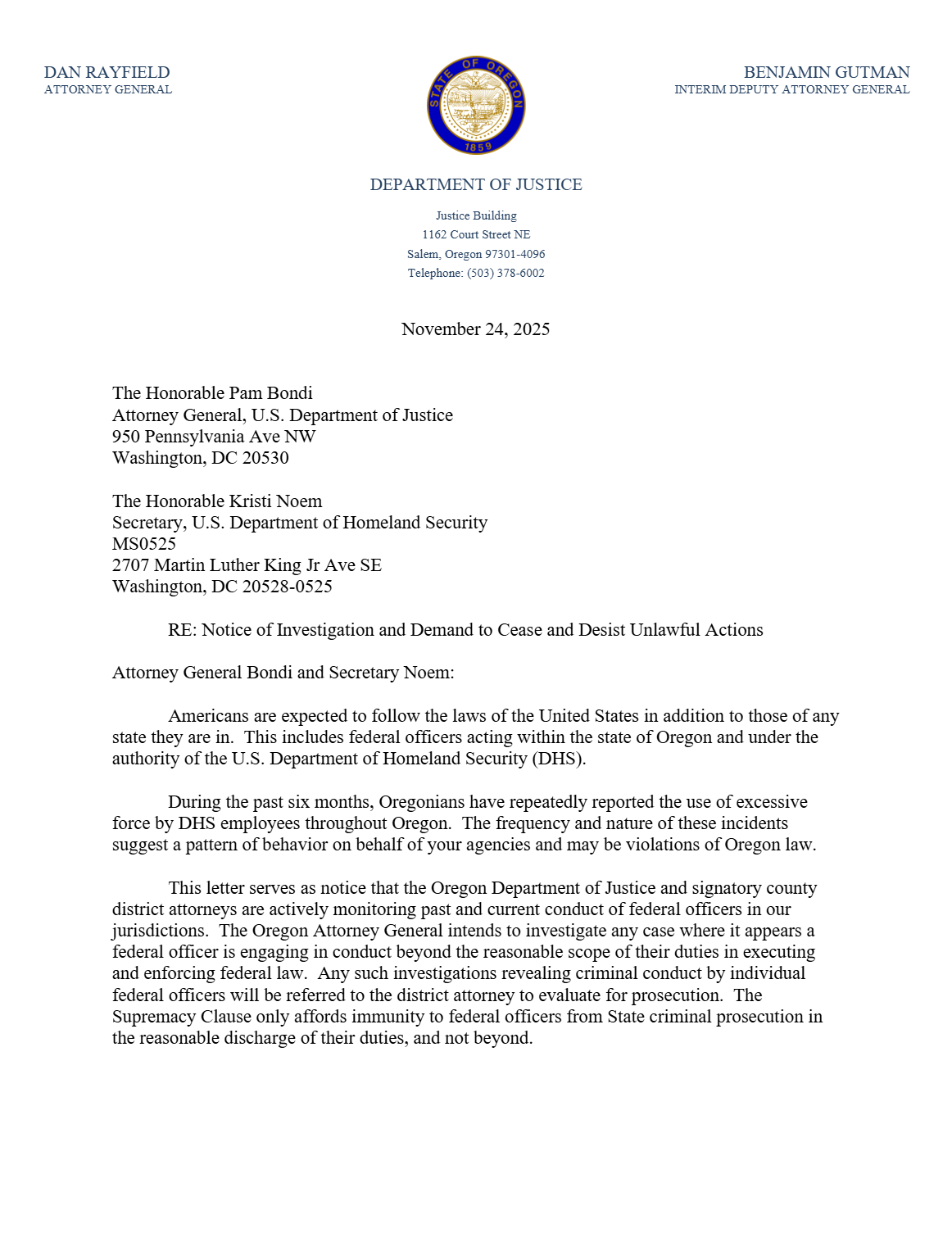 Rayfield and Multnomah County District Attorney Nathan Vasquez, Washington County District Attorney Kevin Barton and Clackamas County District Attorney John Wentworth in a letter to U.S. Attorney General Pam Bondi and Department of Homeland Security Secretary Kristi Noem alleged immigration officers have demonstrated a pattern of excessive force over the past six months on youth, peaceful protesters, Portland Police Bureau officers and Oregon State Police officers.