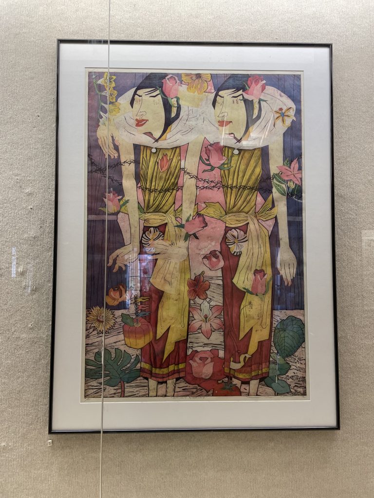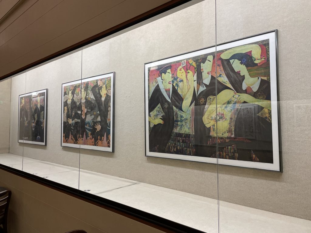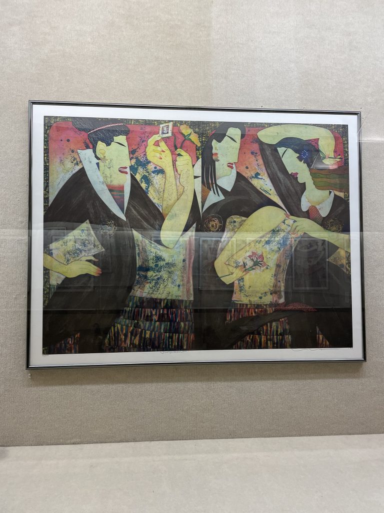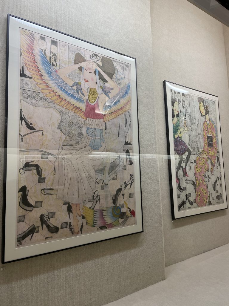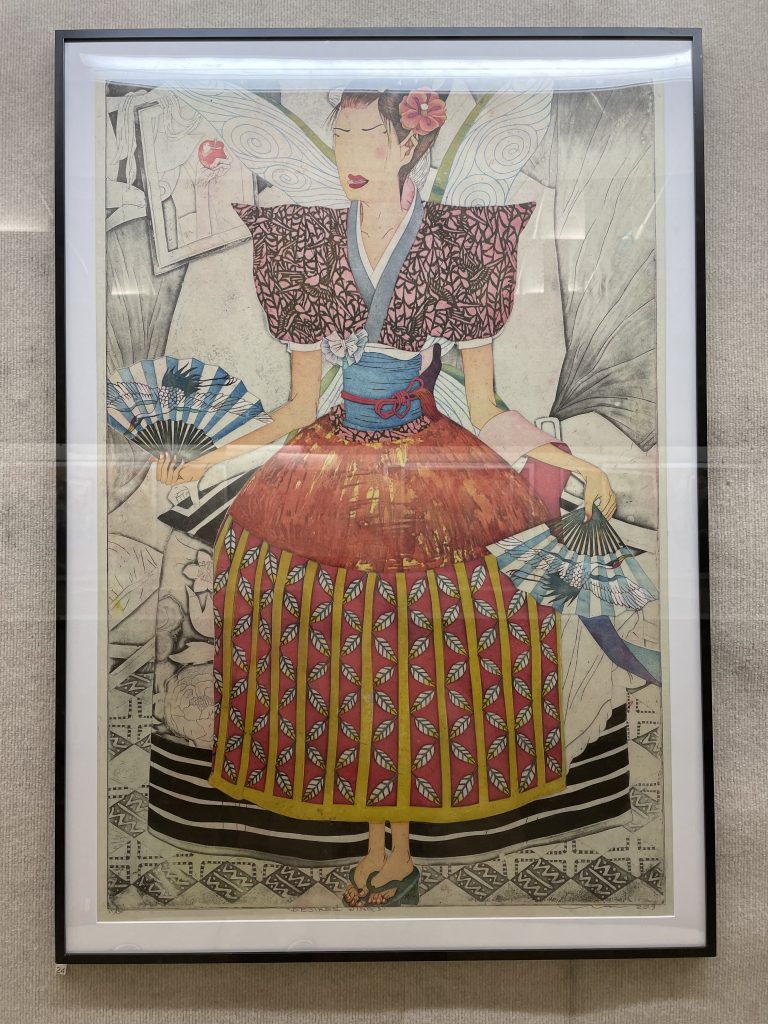 Many of his pieces explore a cultural crossover of sorts: in one piece, a woman is adorned in a traditional kimono top that is combined with a western-style hoop skirt. In another, two women sit together, one dressed in a kimono, and the other wearing a skirt, top, and high heels.