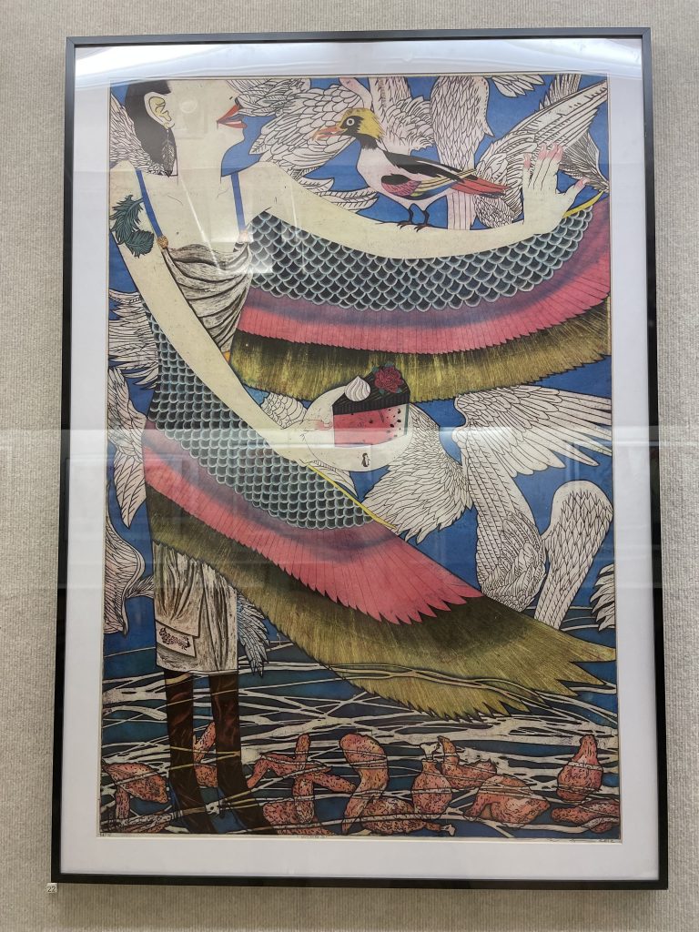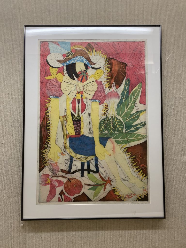 The pieces included in the exhibit are vibrant and full of contrasting hues, showcasing an often whimsical approach to art. Hiratsuka describes his artwork as being focused on the human form, while also incorporating objects such as furniture and elaborate garments. Birds, animals, and fruit often make an appearance in his work as well.
