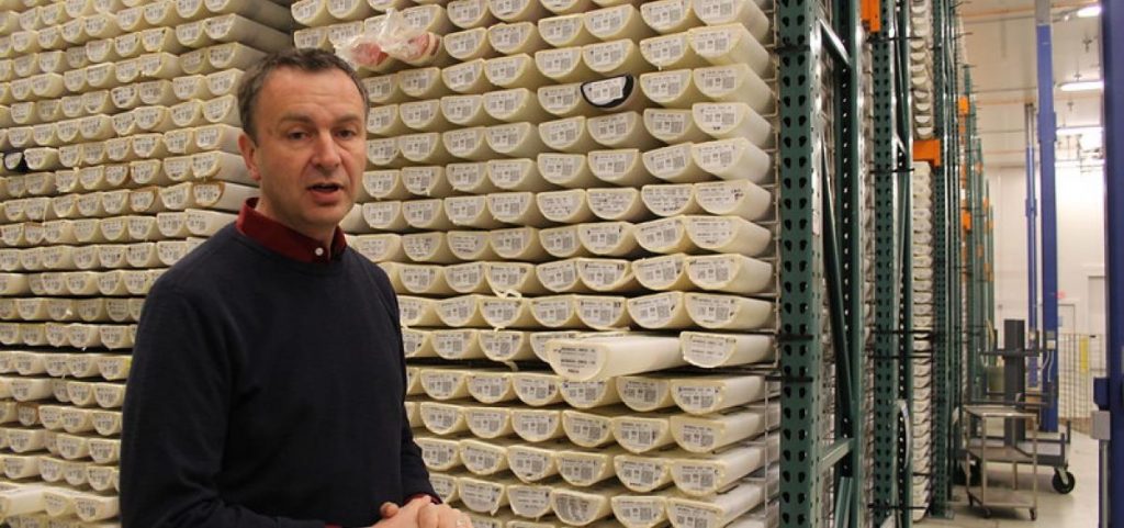 Many of the cores in the collection are stored on racks in an 18,000-square-foot refrigerated warehouse. Some sediment cores as well as a trove of Antarctic ice cores are stored in a freezer kept at 20 degrees below zero Fahrenheit. Rock samples are stored at room temperature in hundreds of gray totes.