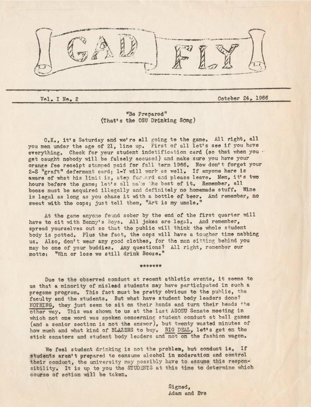 The real hot times for unofficial student publications, though, were the 1960s. That was when OSU hosted the Gad-Fly, the Oracle, the Mutha, Poor Jensen’s Almanac, the Tin Can, the Spark, and the Scab Sheet were produced by students and distributed all over campus.