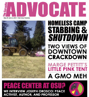 New issue: May 29th, 2014 May 29, 2014This week: Homeless Camp Stabbing & Shutdown; Marge Pettitt's Little Pink Tent; Peace Center at OSU? and much more. Read More1 min read