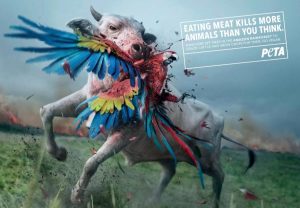 This billboard illustrates the issue by showing a cow attacking a red macaw against a backdrop of flames. It then shows the words “Eating Meat Kills More Animals Than You Think.” The ad explains, “Ranchers set fires in the Amazon rainforest to graze cattle and grow crops to feed them. Go vegan.”