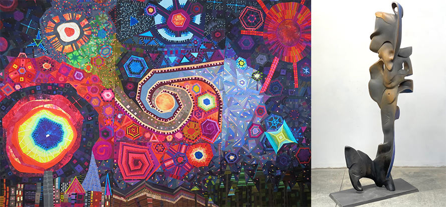 Both exhibitors are prolific Oregon artists, admired for their commitment to their craft. Richey’s wood sculptures articulate space and offer a “felt experience”, while Lorenz’s fiber works explore shape, pattern and color through vibrant quilting techniques. Together they complement each other in form and spirit.