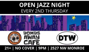 Corvallis Funk & Jazz Jam Series. Bombs Away Café, 2527 NW Monroe Ave., Corvallis. 9 p.m. Free. The 2nd Thursday of every month members of DTW host a jam for anyone interested in Jazz and it’s related genres to come work on their skills. There is a sign up sheet, and we do our best to make sure everyone gets some play time. Come prepared with a few common songs from the genres, and come ready to play! House band opens with a short set (usually 0:45 min), and then the stage is open to jammers. Jam will go later than 11 if there is a healthy crowd!! Visit https://www.bombsawaycafe.com for info about this event.