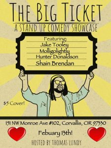 The Big Ticket! February Valentines Show. The Pig & Olive, 151 NW Monroe Ave., Corvallis. 10:00 p.m. $5. Welcome back! This month the Big Ticket is back with another fantastic night of stand up comedy! This month our show is right before Valentines Day and coming out to the show is perfect date idea! Visit https://www.facebook.com/events/468933970448157/ for more info.