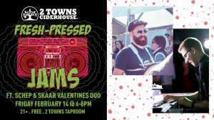 Fresh-Pressed Jams ft. Schep & Skaar Valentine’s Day Duo. 2 Towns Ciderhouse, 33930 SE Eastgate Cir., Corvallis. 6 p.m. Free. Local musicians who know how to bring the funk. Whether it’s Valentines or Galentines, start your weekend off with some Valentine’s Day classics brought to you by Schep & Bryson Skarr! Visit https://www.facebook.com/events/764598770716018/ for more info.