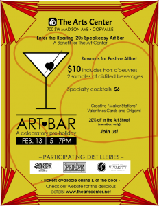 Art Bar. The Art Center, 700 SW Madison, Corvallis. 5 p.m. – 7 p.m. $10. The stage is set for a ’20s speakeasy at the Art Center! Enjoy a little pre-Valentine’s celebration featuring Spiritopia, Vivacity Spirits, and Sinister Craft! These distilleries will be sharing samples of their handcrafted beverages in the beautiful main gallery of the Art Center. There will also be live jazz, delicious, hearty snacks, and maker stations where you can create seasonal greeting cards. Admission is $10, which includes two samples and appetizers. Additional specialty cocktails are $6 each. Proceeds will benefit the Art Center. This event is 21+ only. Visit https://theartscenter.net/ for more info.
