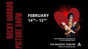 The Rocky Horror Picture Show. Majestic Theatre, 115 SW 2nd St., Corvallis. 6:00 p.m. $15. Concerning all Rocky Horror Creatures of the Night: Add a little Transylvanian magic to your VDay with the Majestic’s Rocky Horror Picture Show Experience! Come early and have a photoshoot with friends posing with Rocky Horror Face-In-Hole cutouts or lounge in the Doctor’s throne on the stage under the Transylvanian Convention banner. New this year: Two casts! The Majestic Rocky Horror Shadow Cast will perform the Feb. 14, 7 p.m. and the Feb. 15, 12 a.m. shows. Tart of the Valley Burlesque will perform the Feb. 14, 12 a.m. and the Feb. 15, 7 p.m. shows. Visit http://www.majestic.org/ for more info.