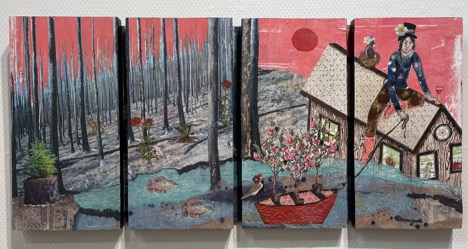 A number of pieces in the show were inspired by fire, a subject that is close to home for many Oregonians, especially after the frightening wildfire seasons of recent years. “Nature Creates Beauty from Darkness,” by Elmira Bets Cole, sees the aftermath of Oregon fires as a reminder of the resilience of humans and the ability of nature to re-establish itself and flourish once more.
